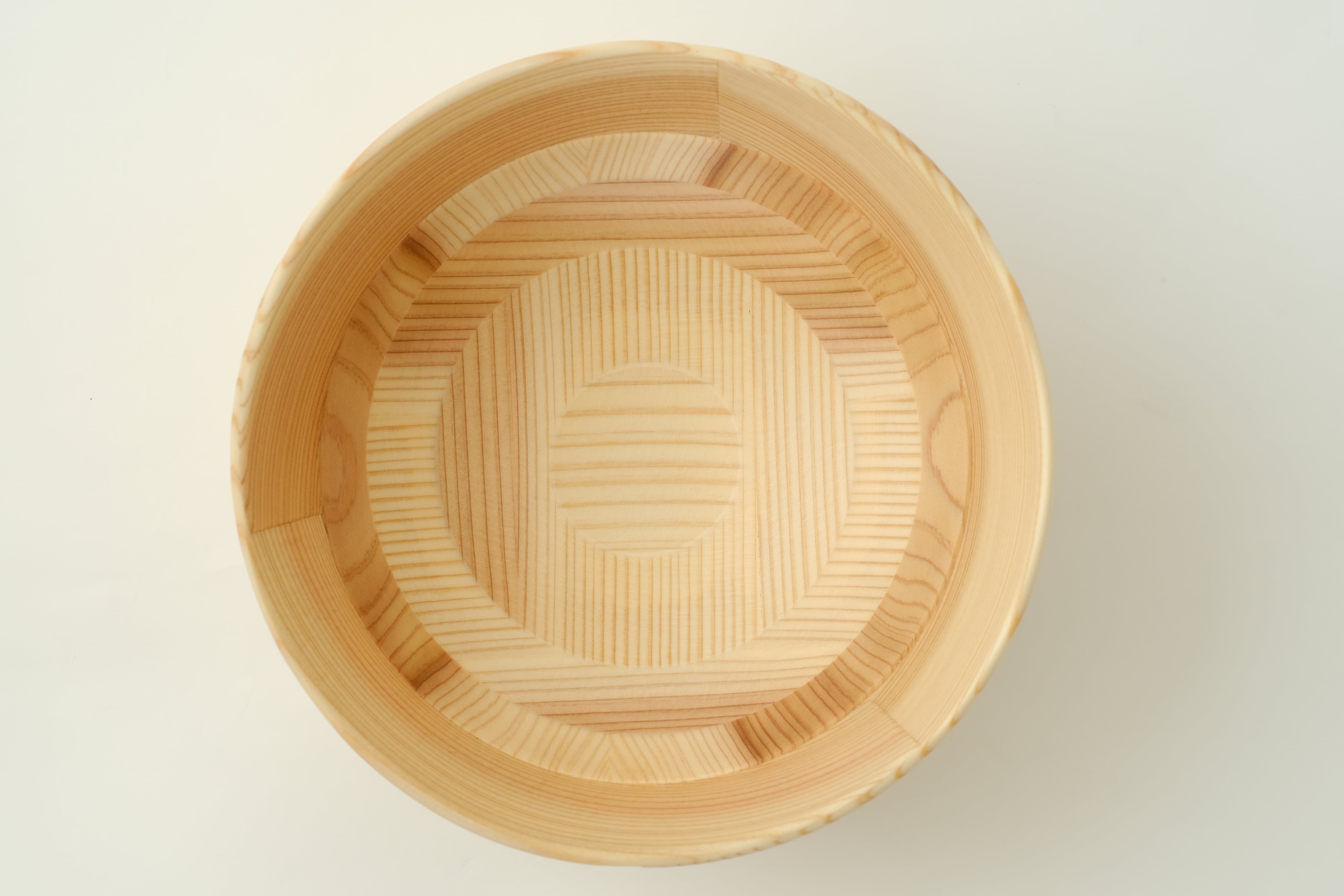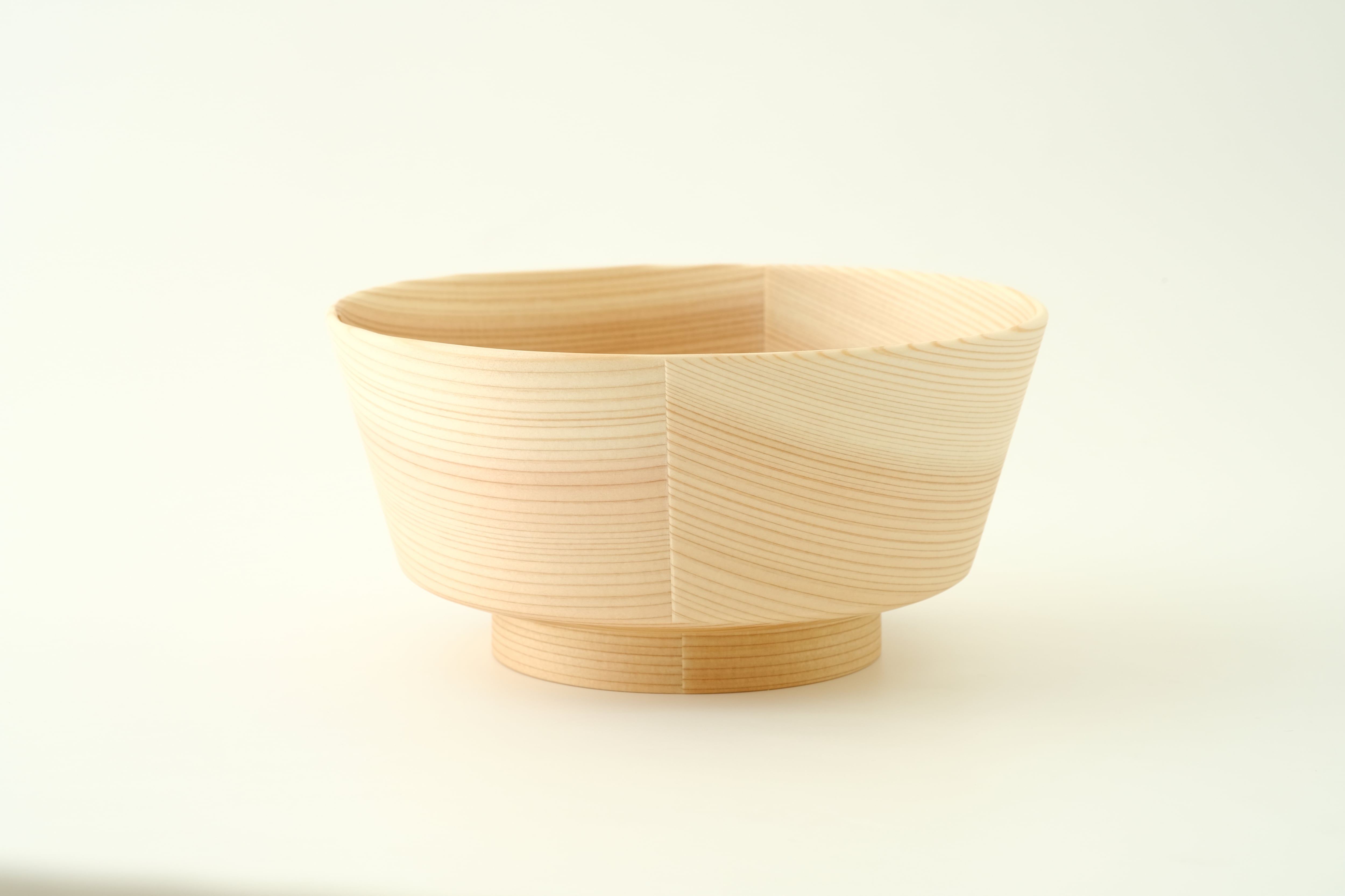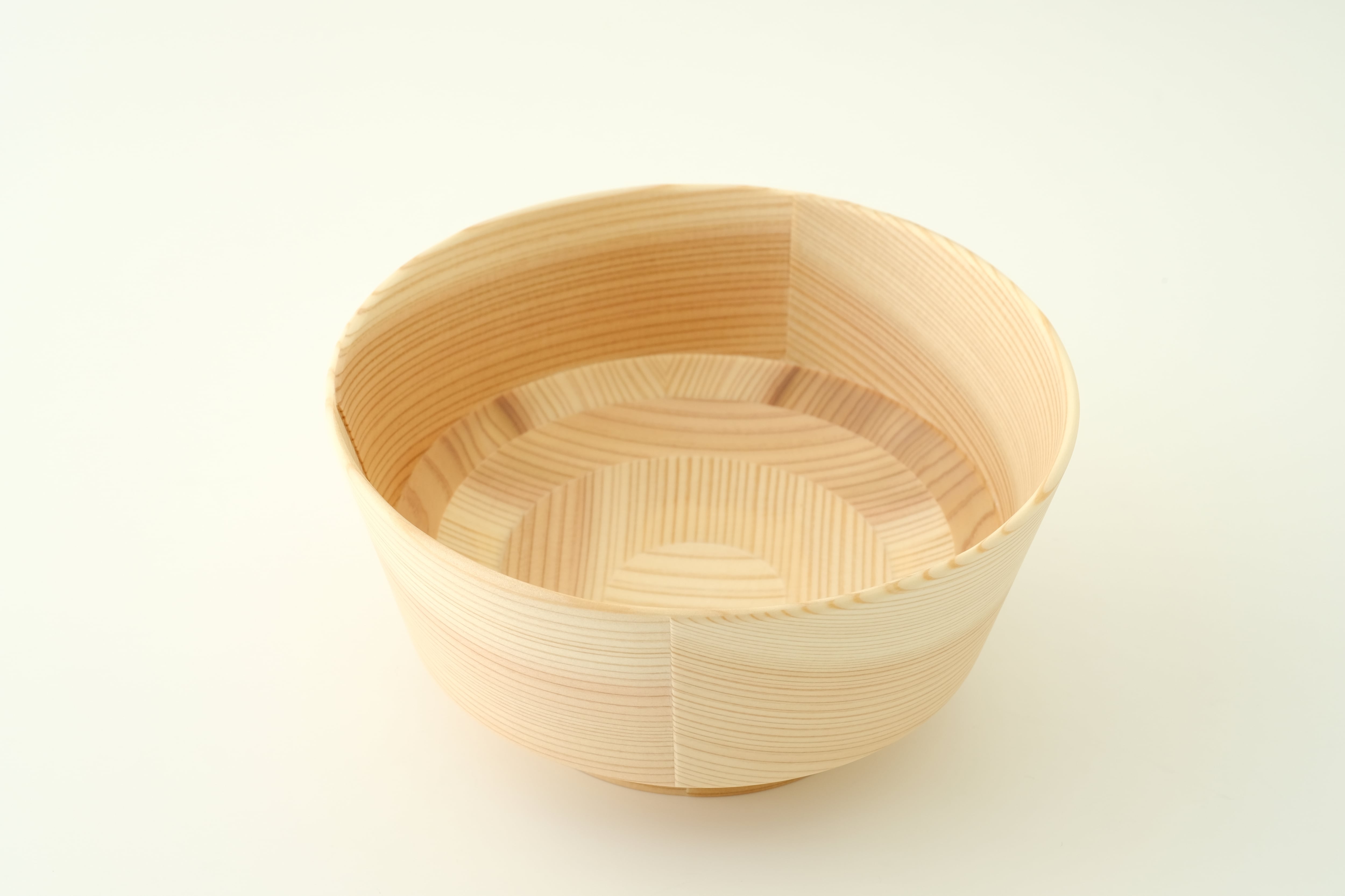 「曲げわっぱ」は、その円が小さいほど曲げるのが難しく、良質な材と高い技術が必要とされます。杉の温かい手触りと驚くほどの軽さを実感いただきたい一品です。