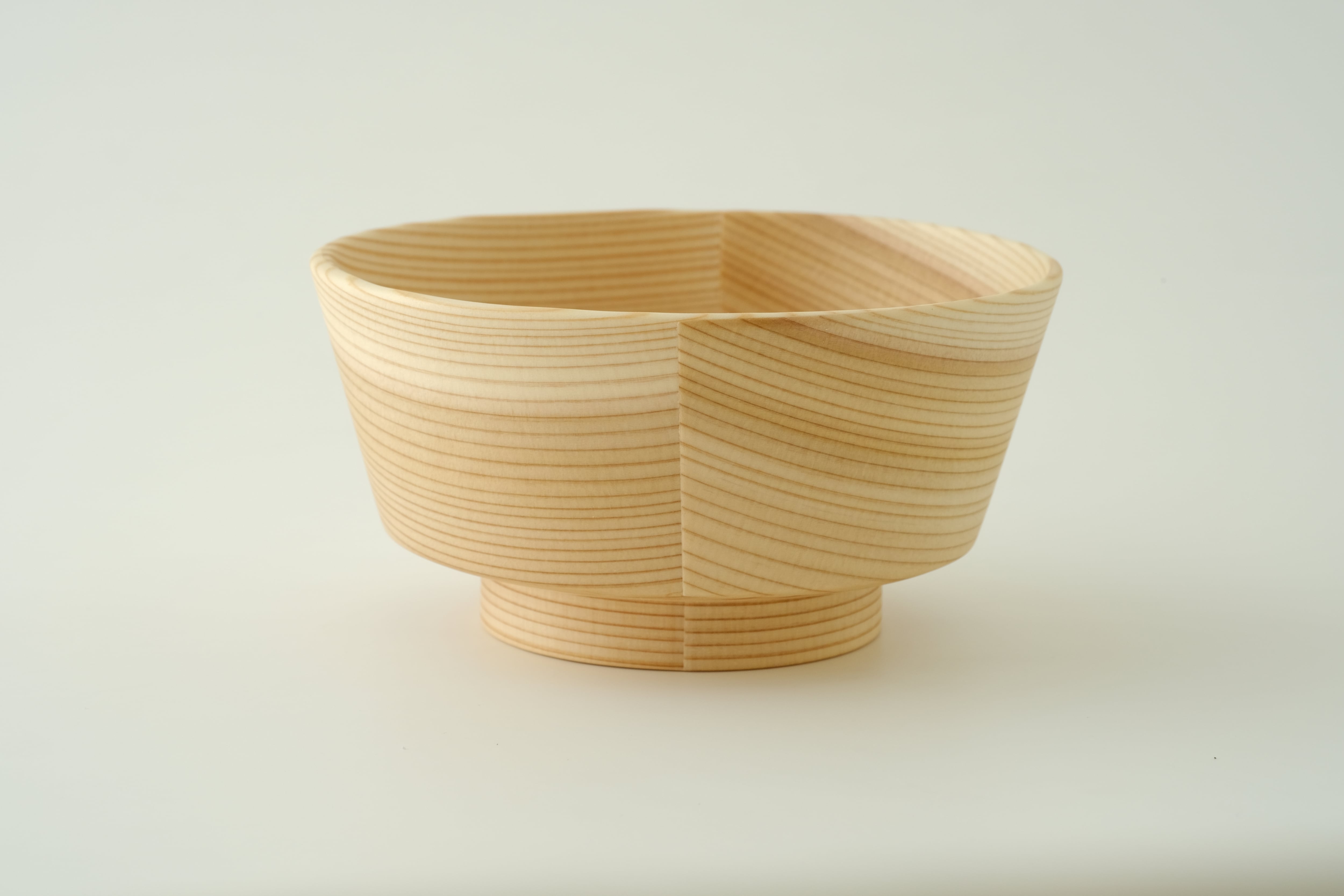 「曲げわっぱ」は、その円が小さいほど曲げるのが難しく、良質な材と高い技術が必要とされます。杉の温かい手触りと驚くほどの軽さを実感いただきたい一品です。
