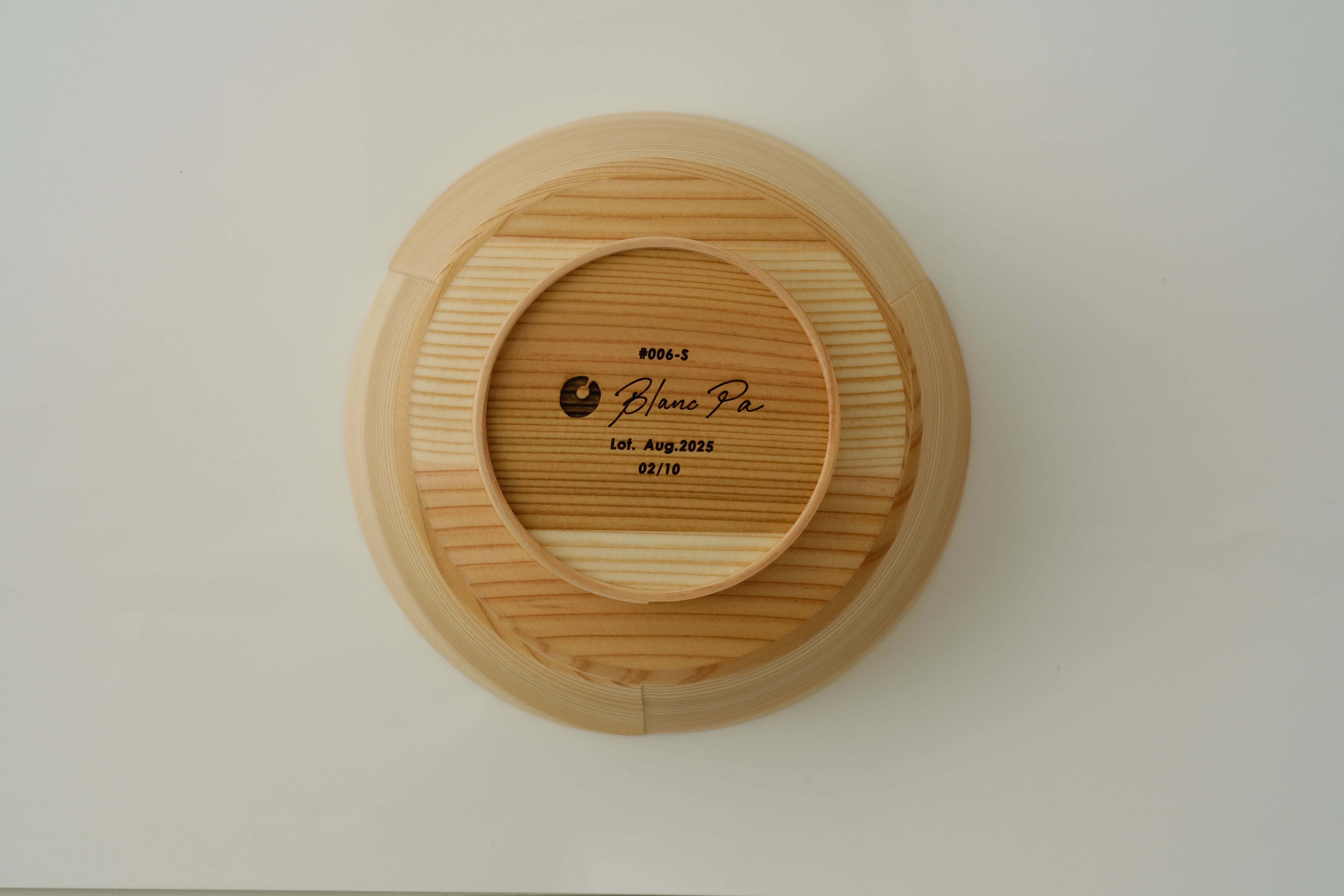 「曲げわっぱ」は、その円が小さいほど曲げるのが難しく、良質な材と高い技術が必要とされます。杉の温かい手触りと驚くほどの軽さを実感いただきたい一品です。