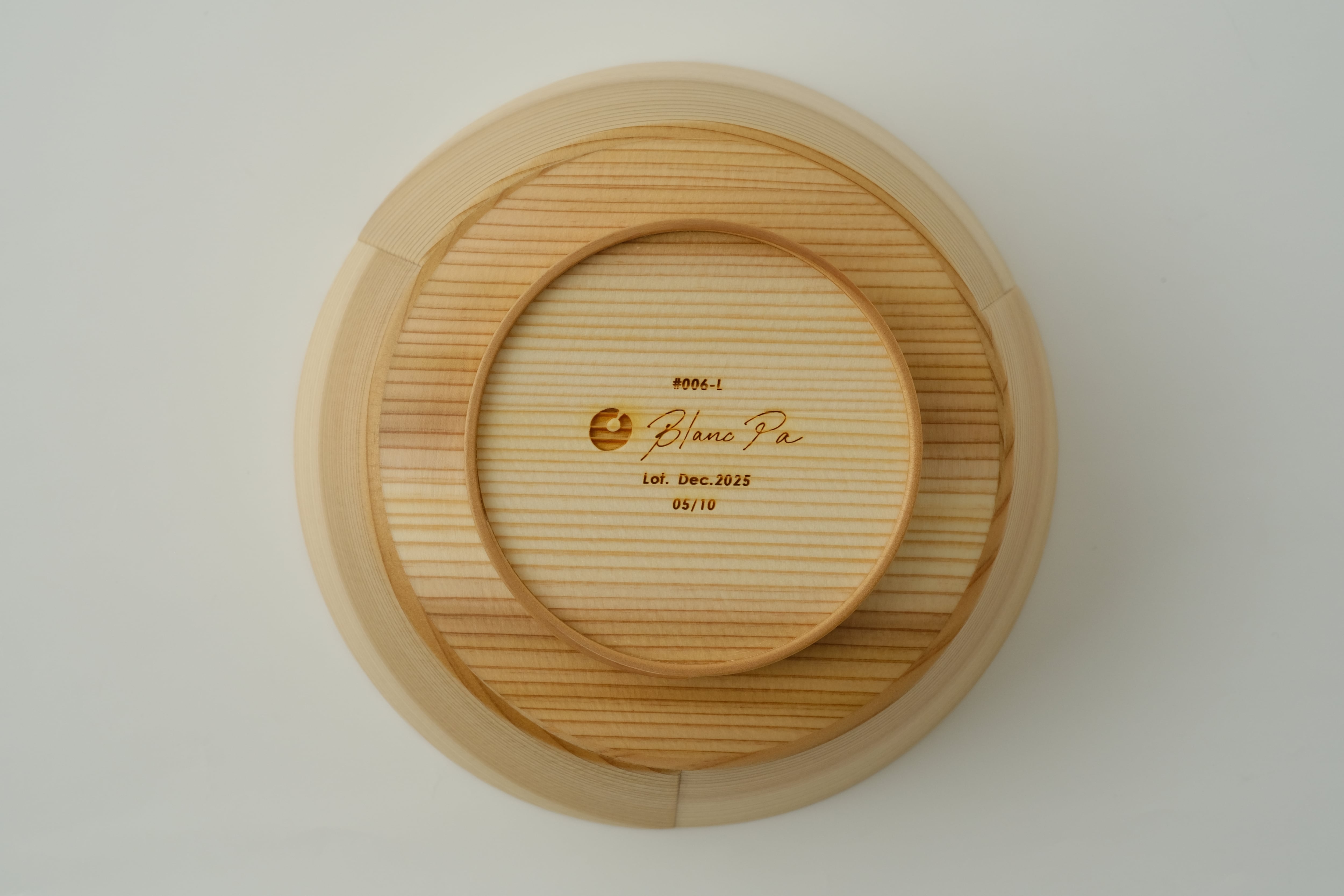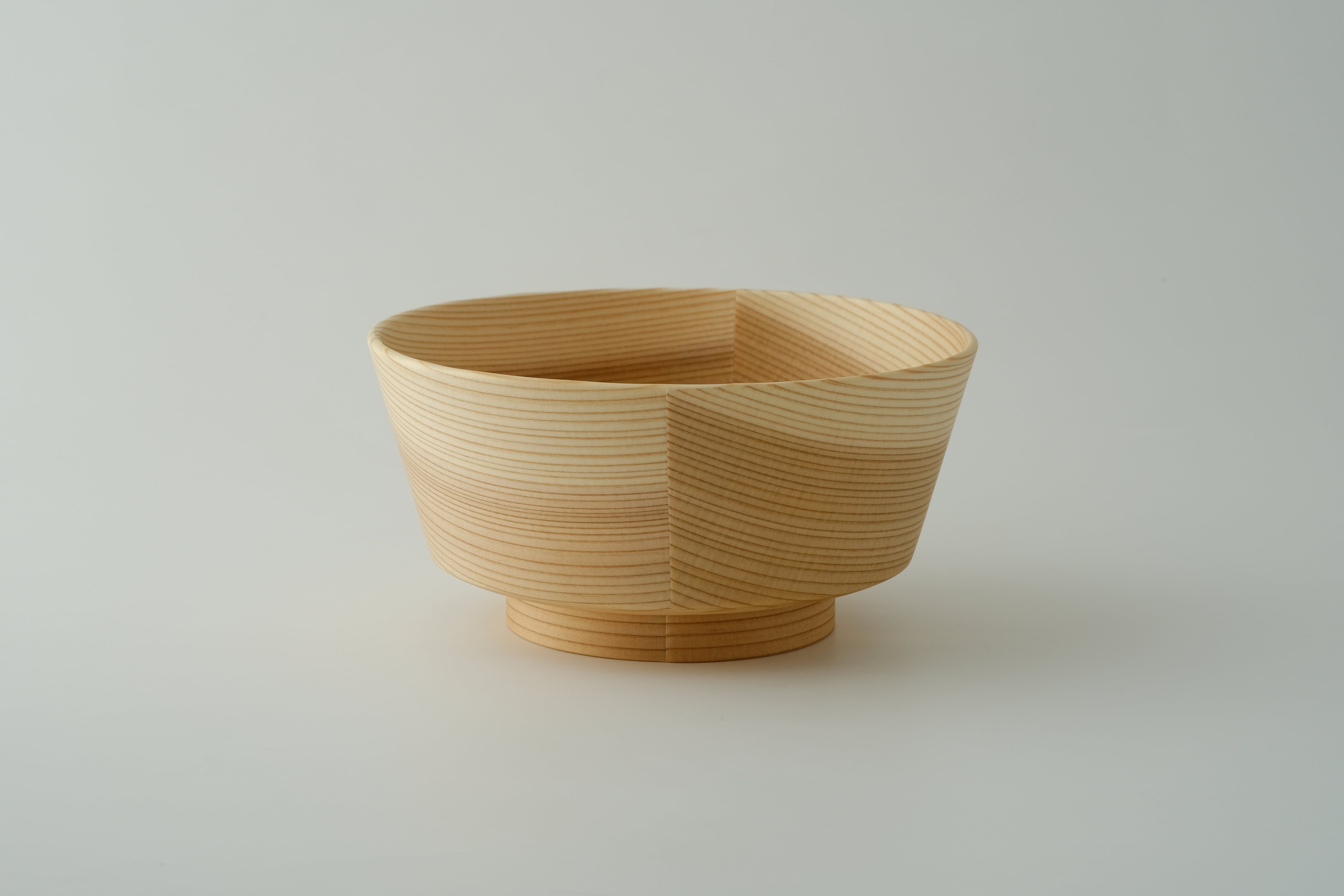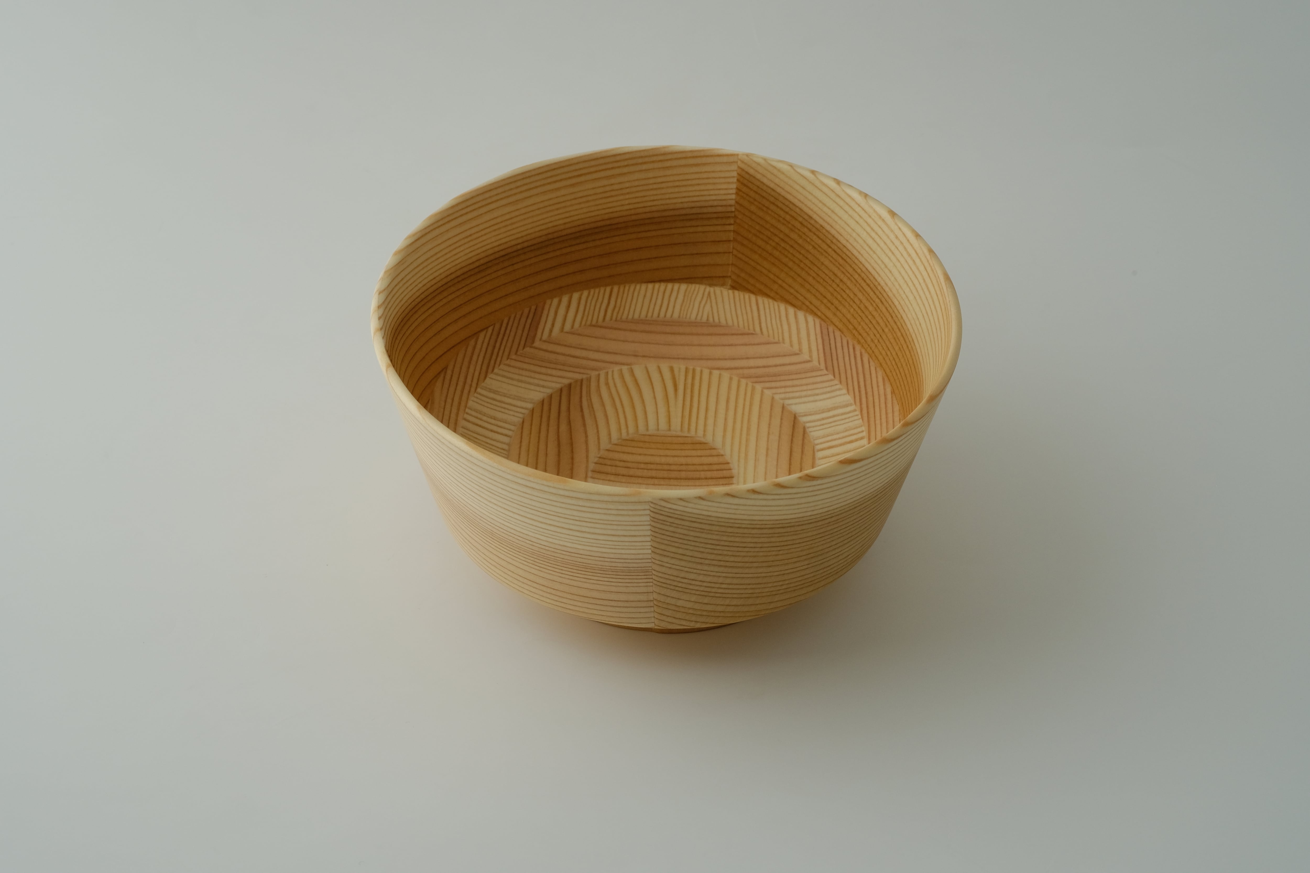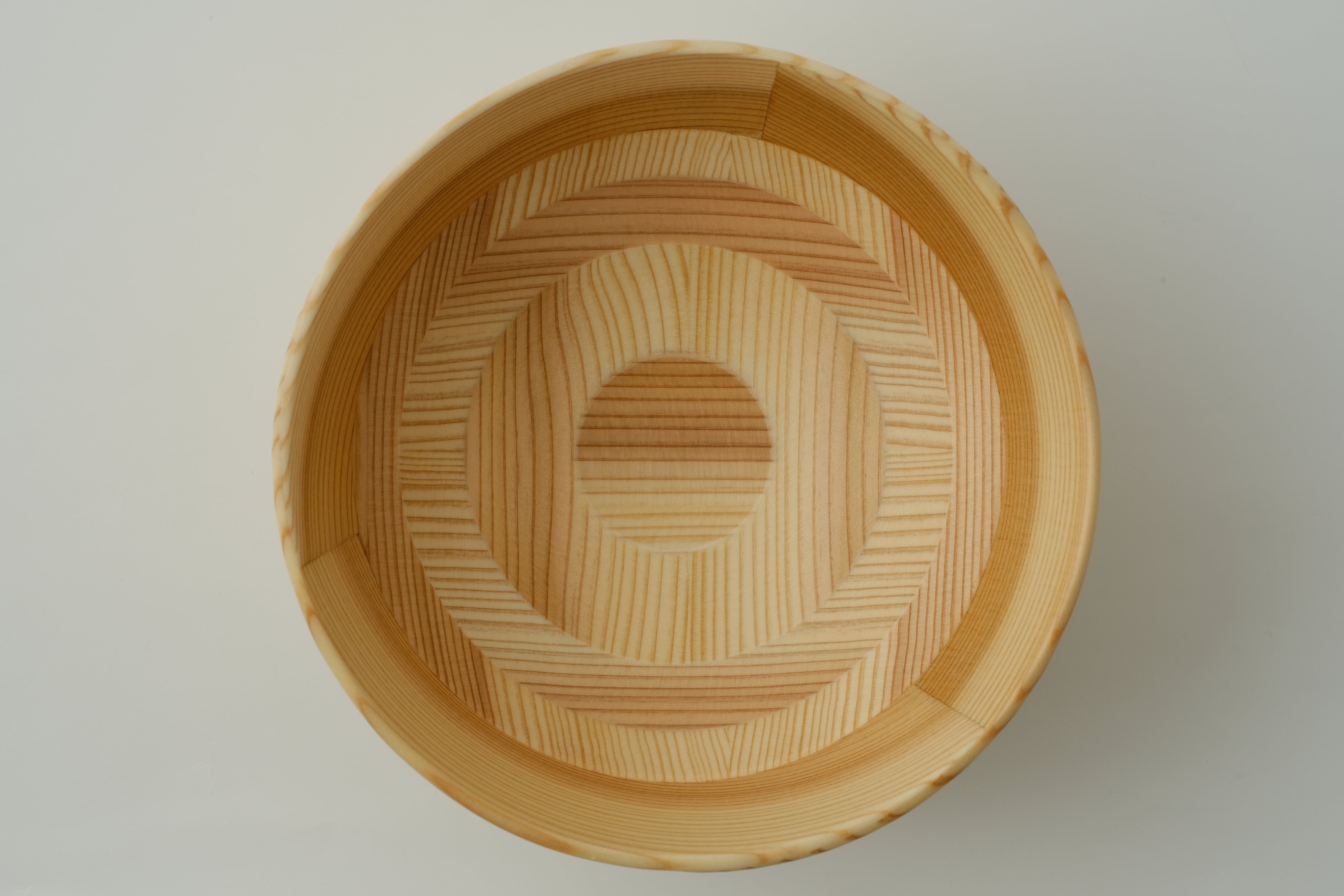 「曲げわっぱ」は、その円が小さいほど曲げるのが難しく、良質な材と高い技術が必要とされます。杉の温かい手触りと驚くほどの軽さを実感いただきたい一品です。