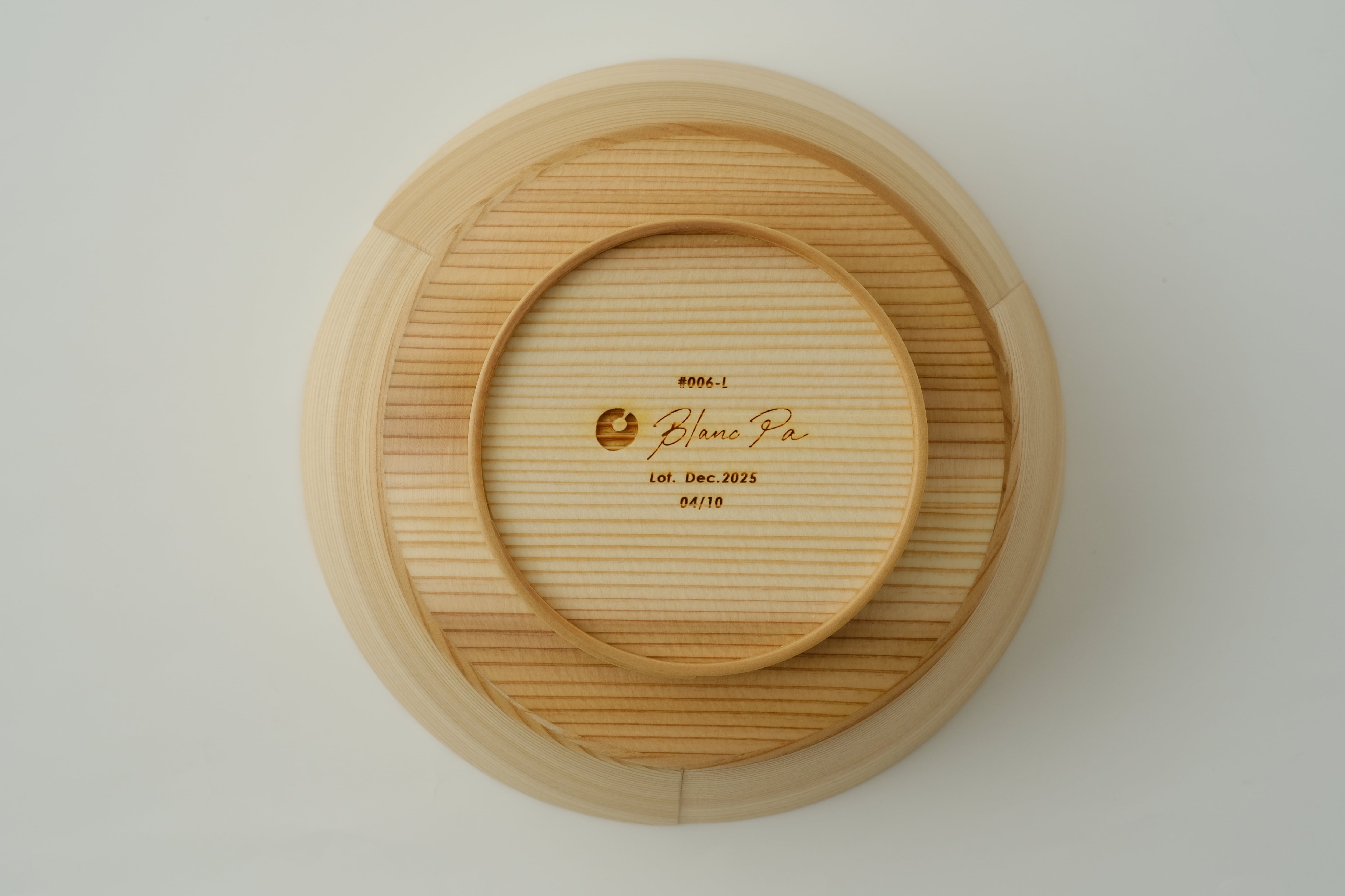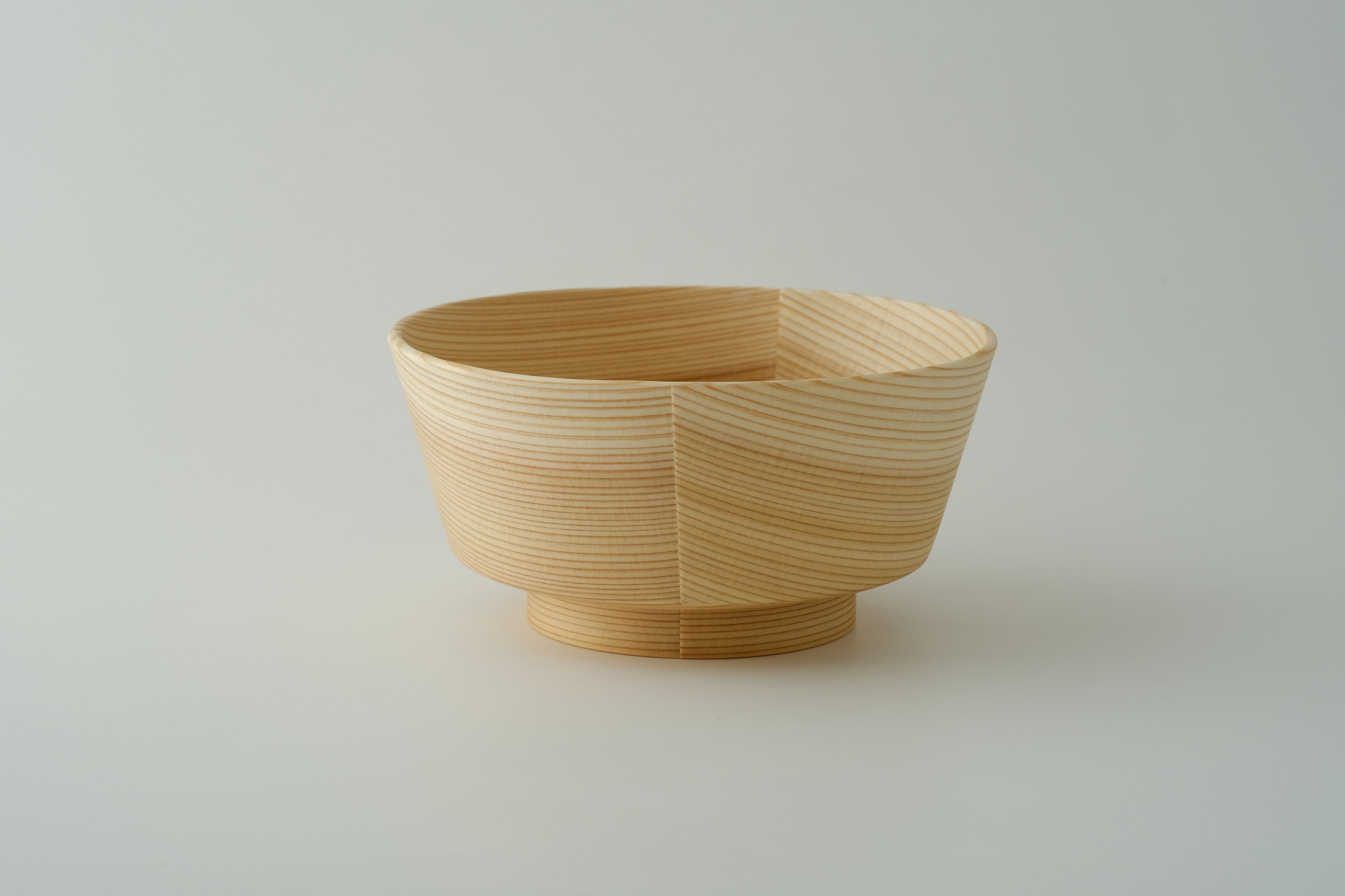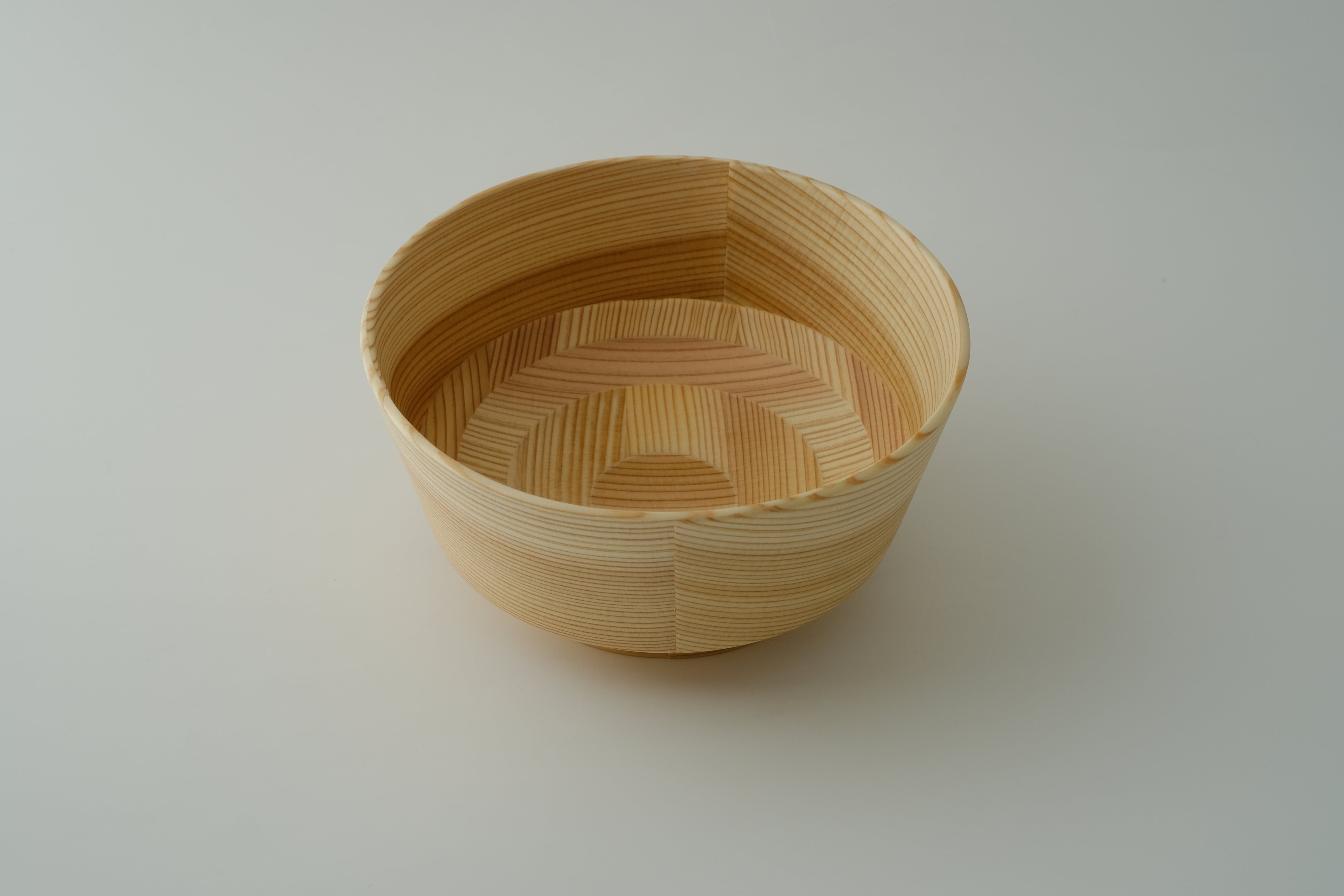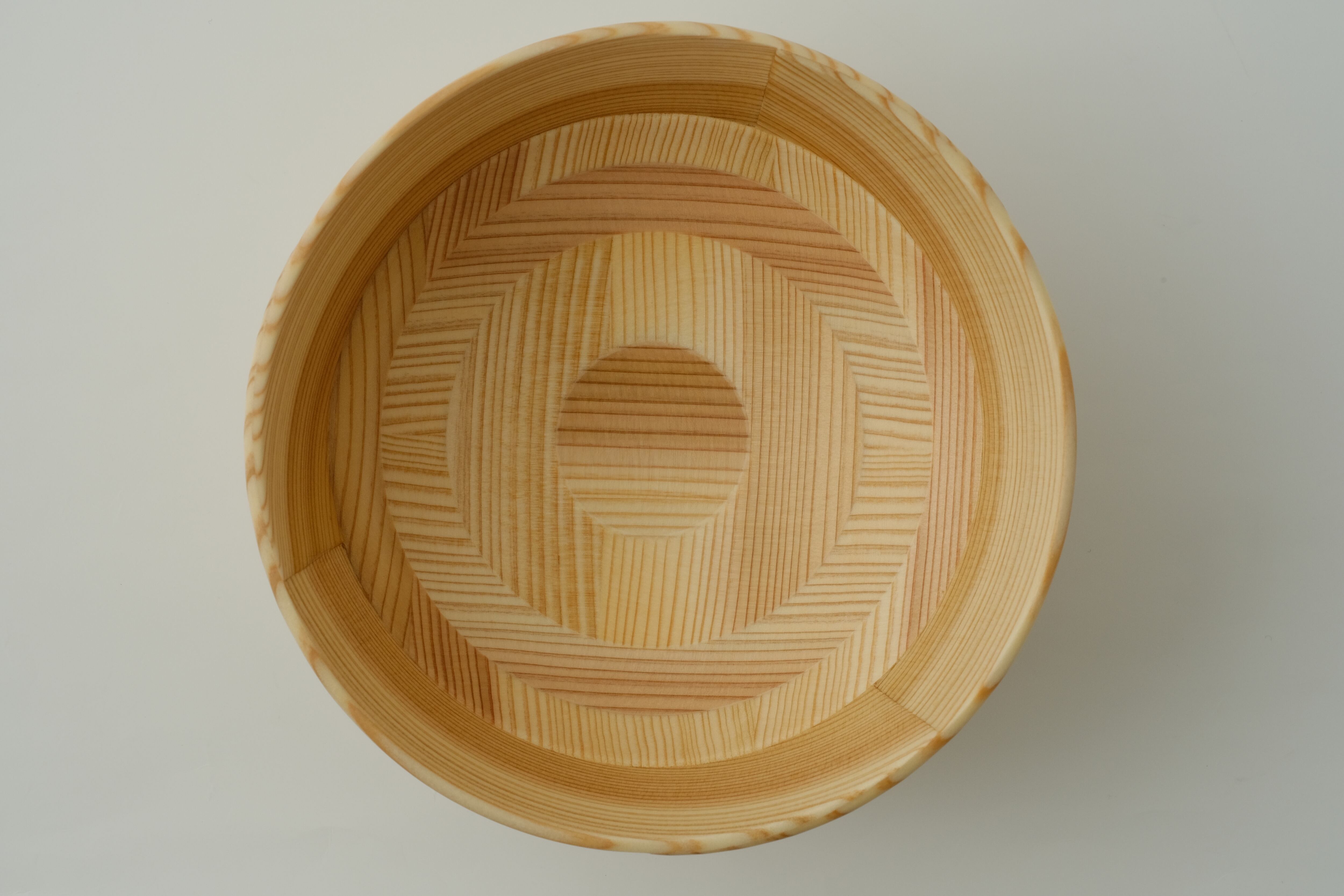 「曲げわっぱ」は、その円が小さいほど曲げるのが難しく、良質な材と高い技術が必要とされます。杉の温かい手触りと驚くほどの軽さを実感いただきたい一品です。