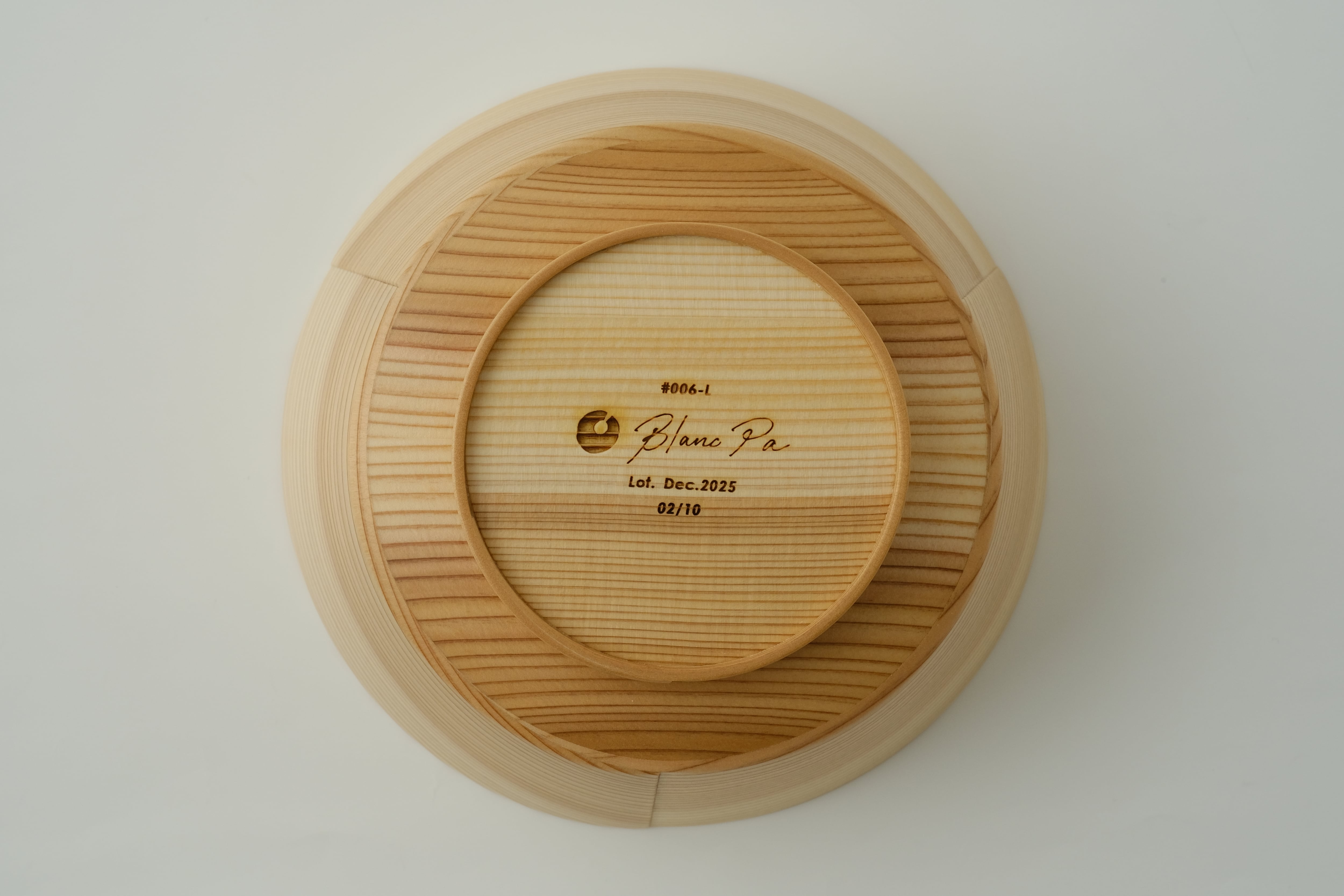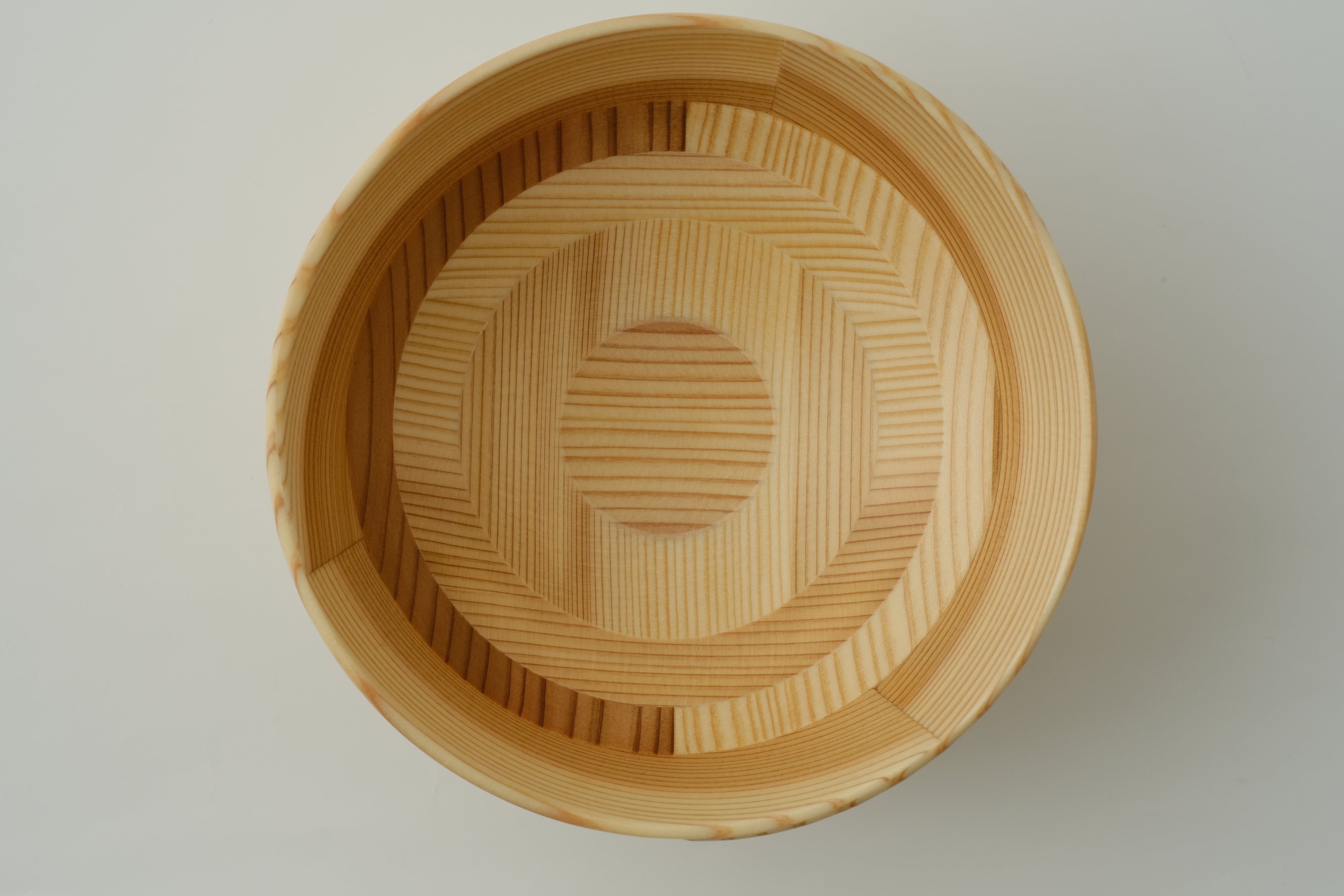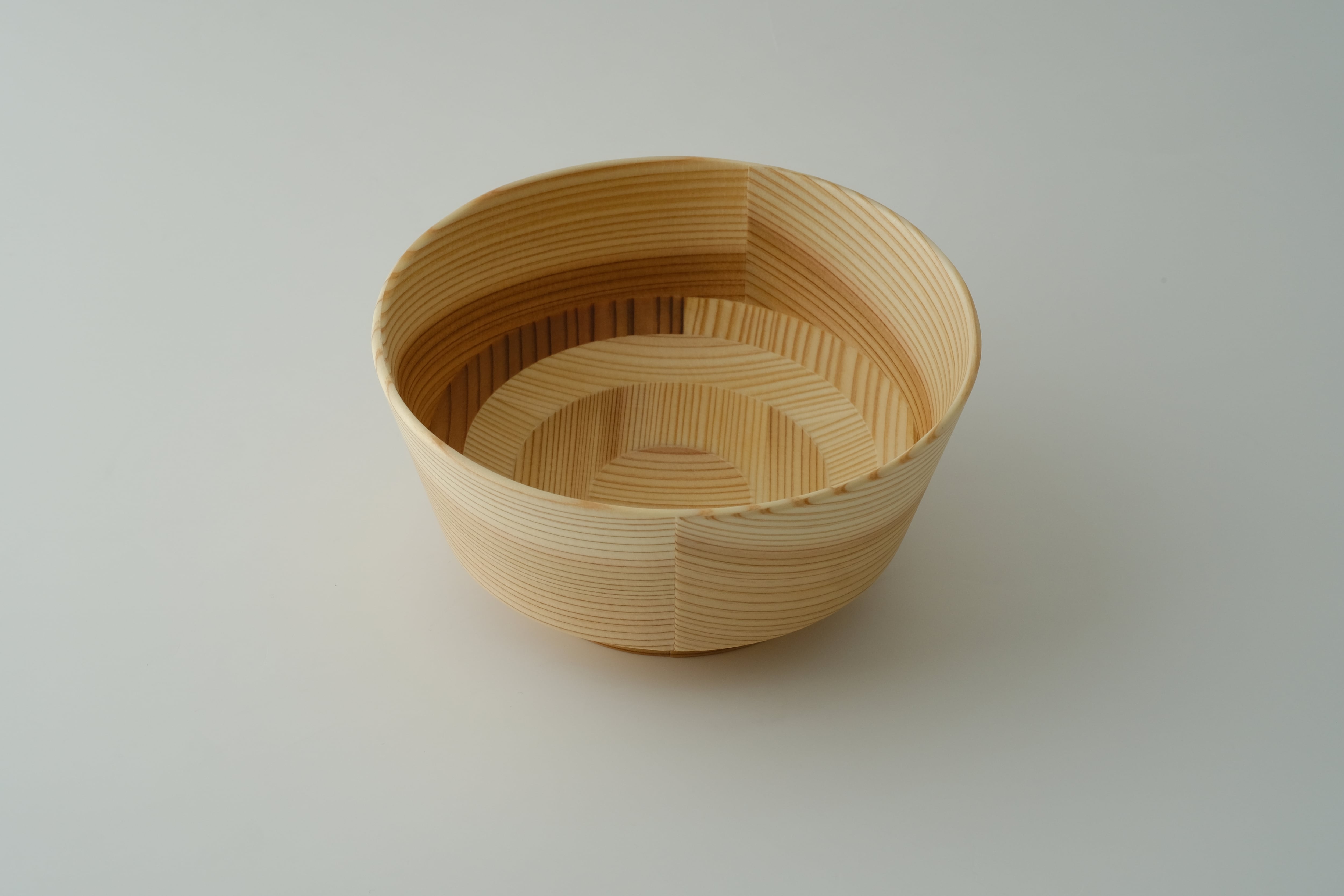 「曲げわっぱ」は、その円が小さいほど曲げるのが難しく、良質な材と高い技術が必要とされます。杉の温かい手触りと驚くほどの軽さを実感いただきたい一品です。
