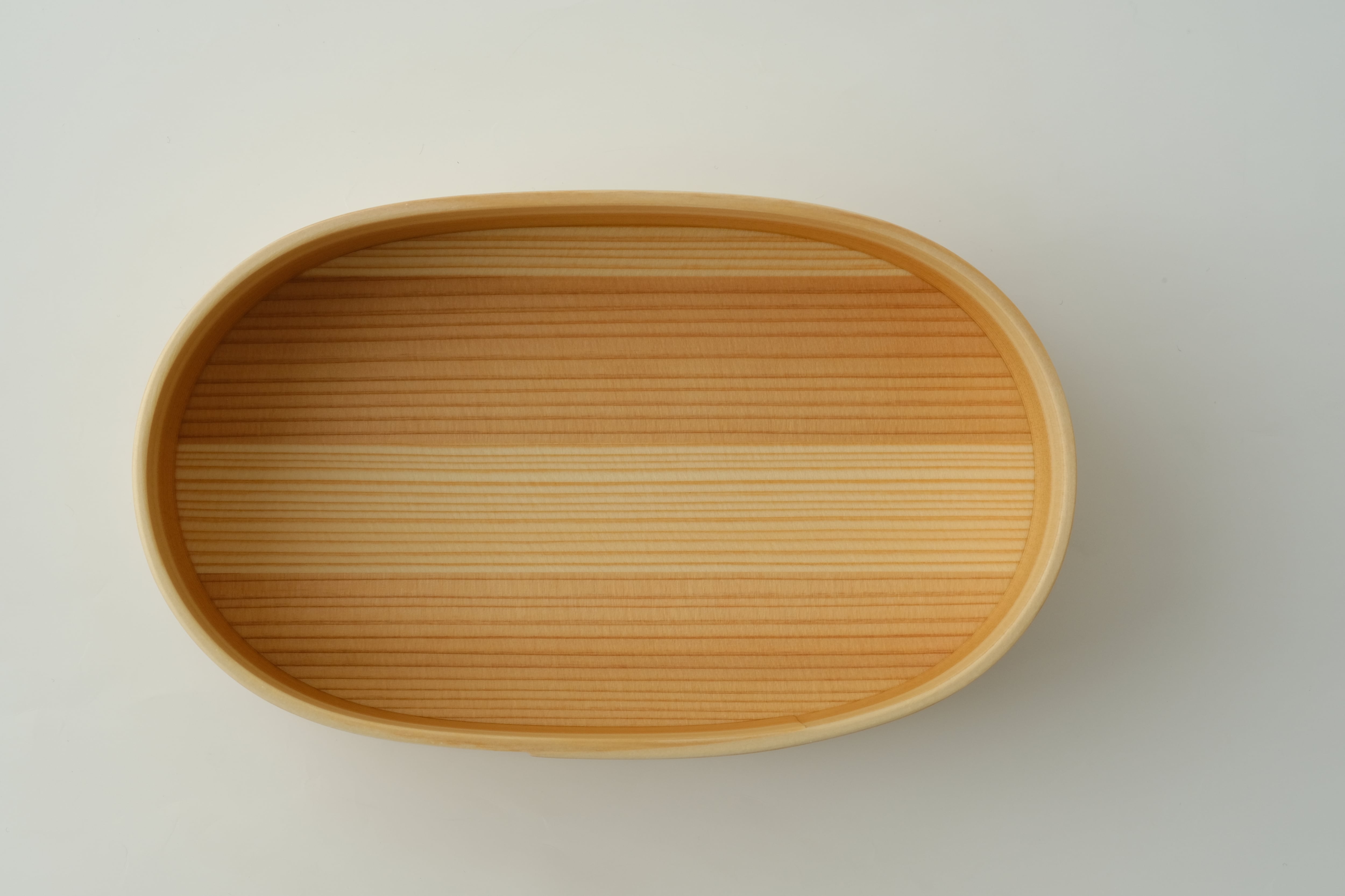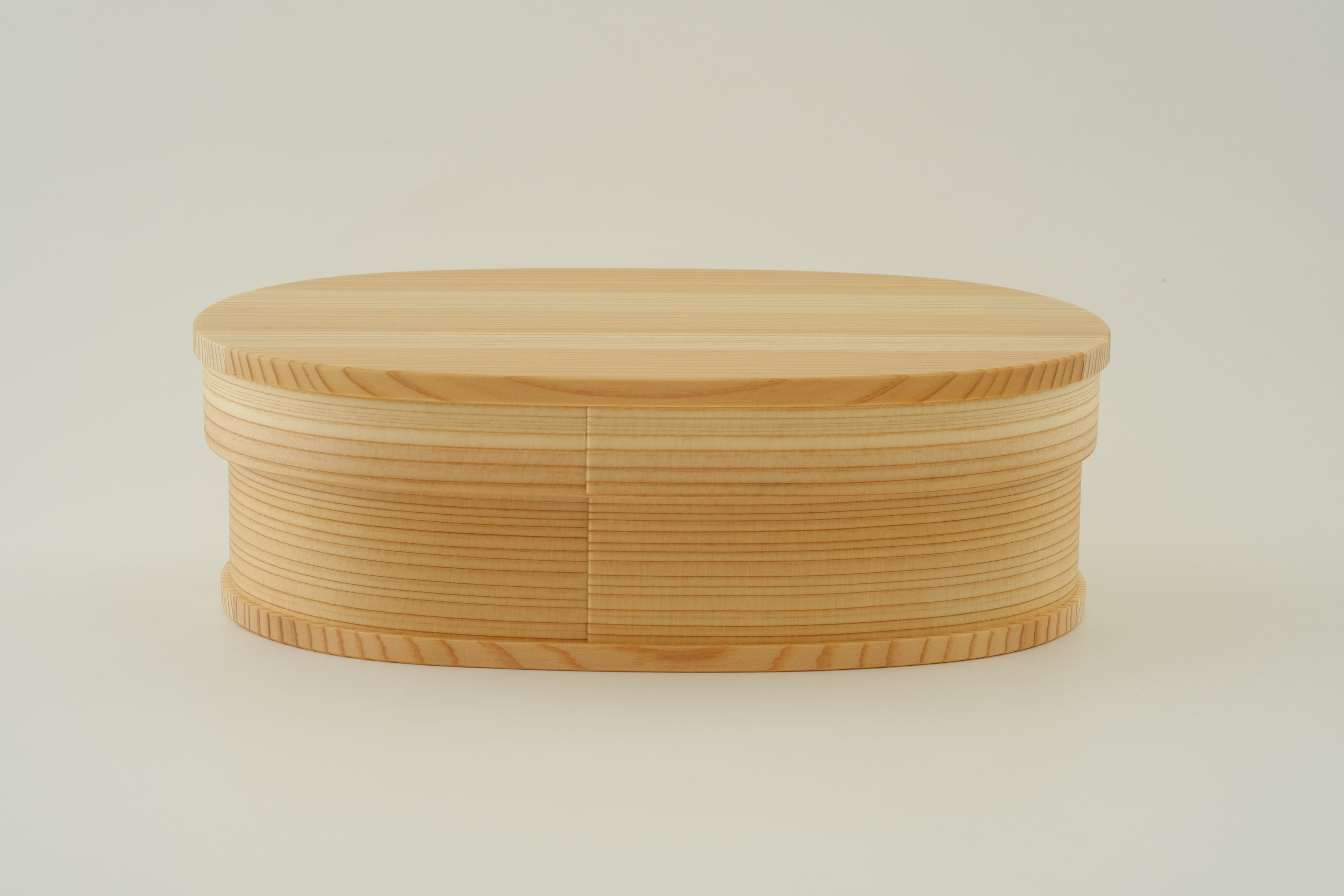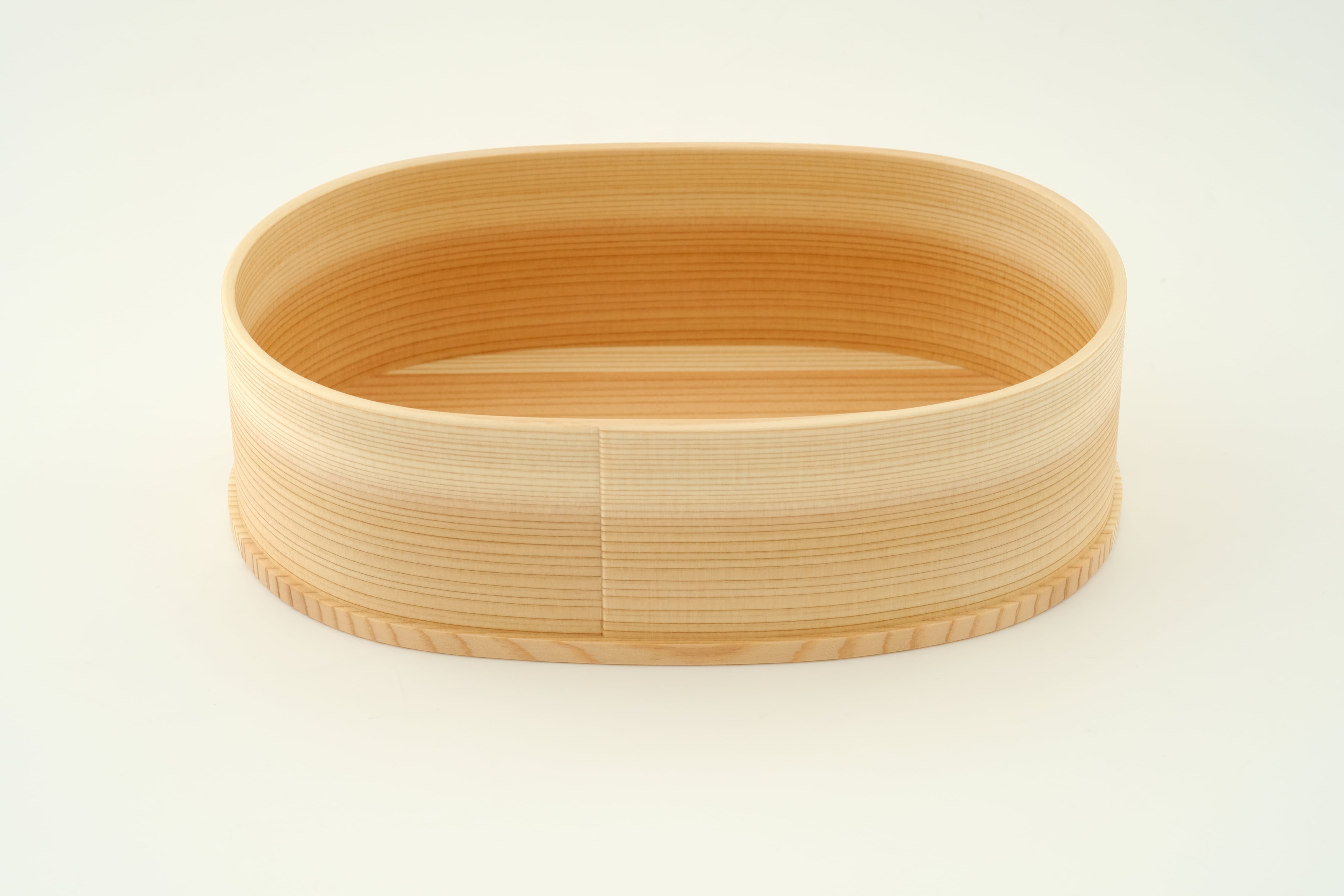 「曲げわっぱ」は、その円が小さいほど曲げるのが難しく、良質な材と高い技術が必要とされます。杉の温かい手触りと驚くほどの軽さを実感いただきたい一品です。