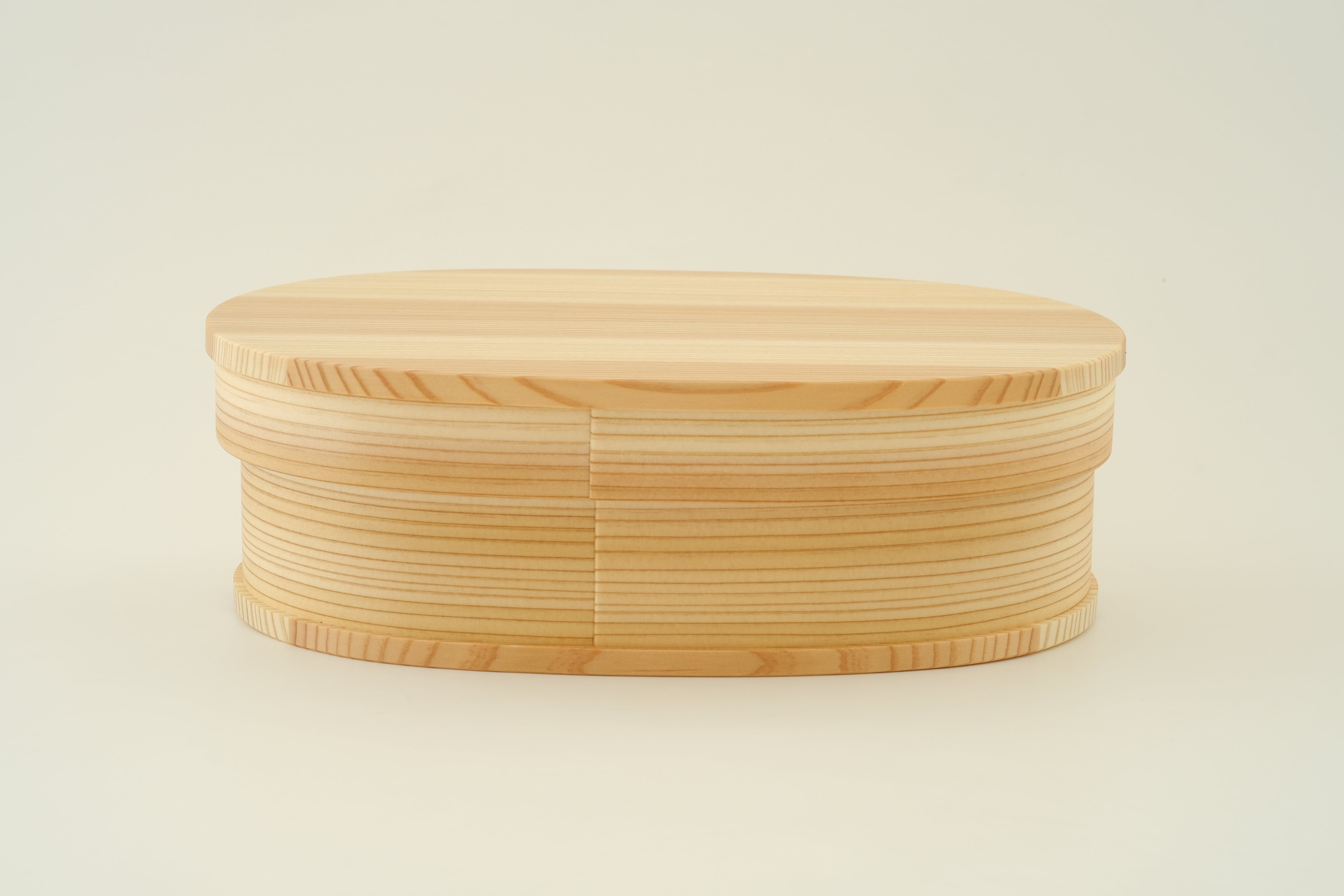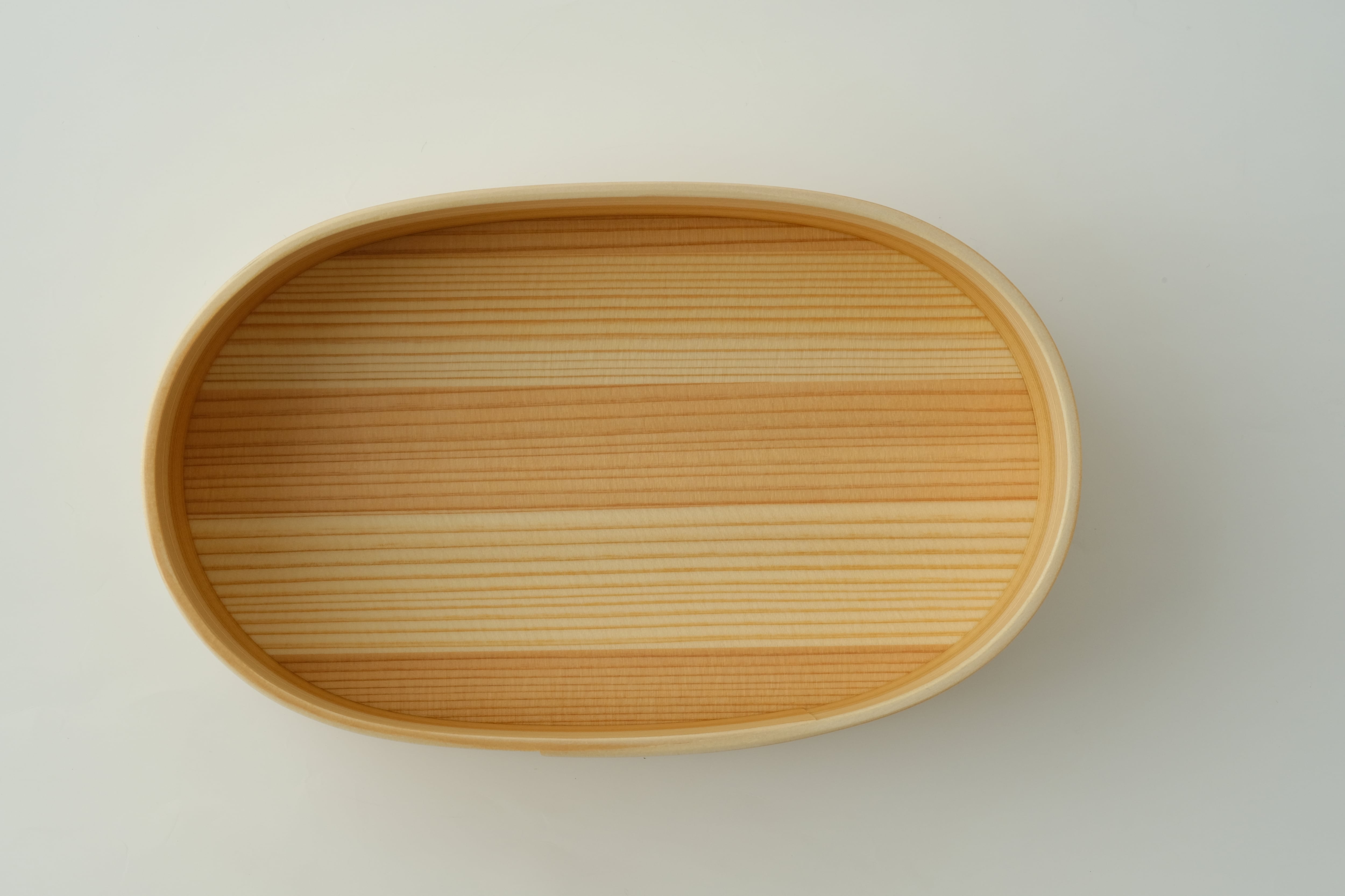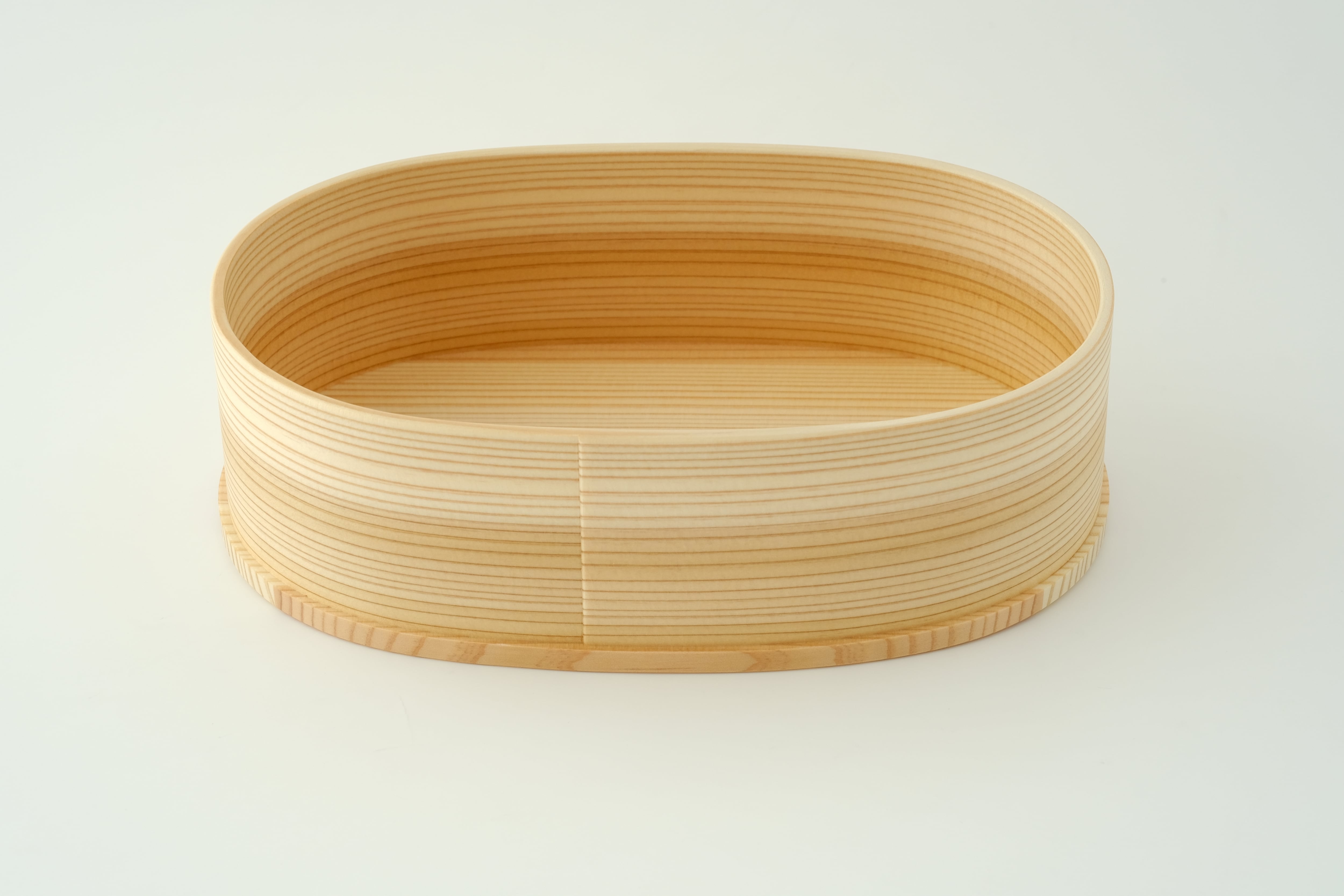 「曲げわっぱ」は、その円が小さいほど曲げるのが難しく、良質な材と高い技術が必要とされます。杉の温かい手触りと驚くほどの軽さを実感いただきたい一品です。