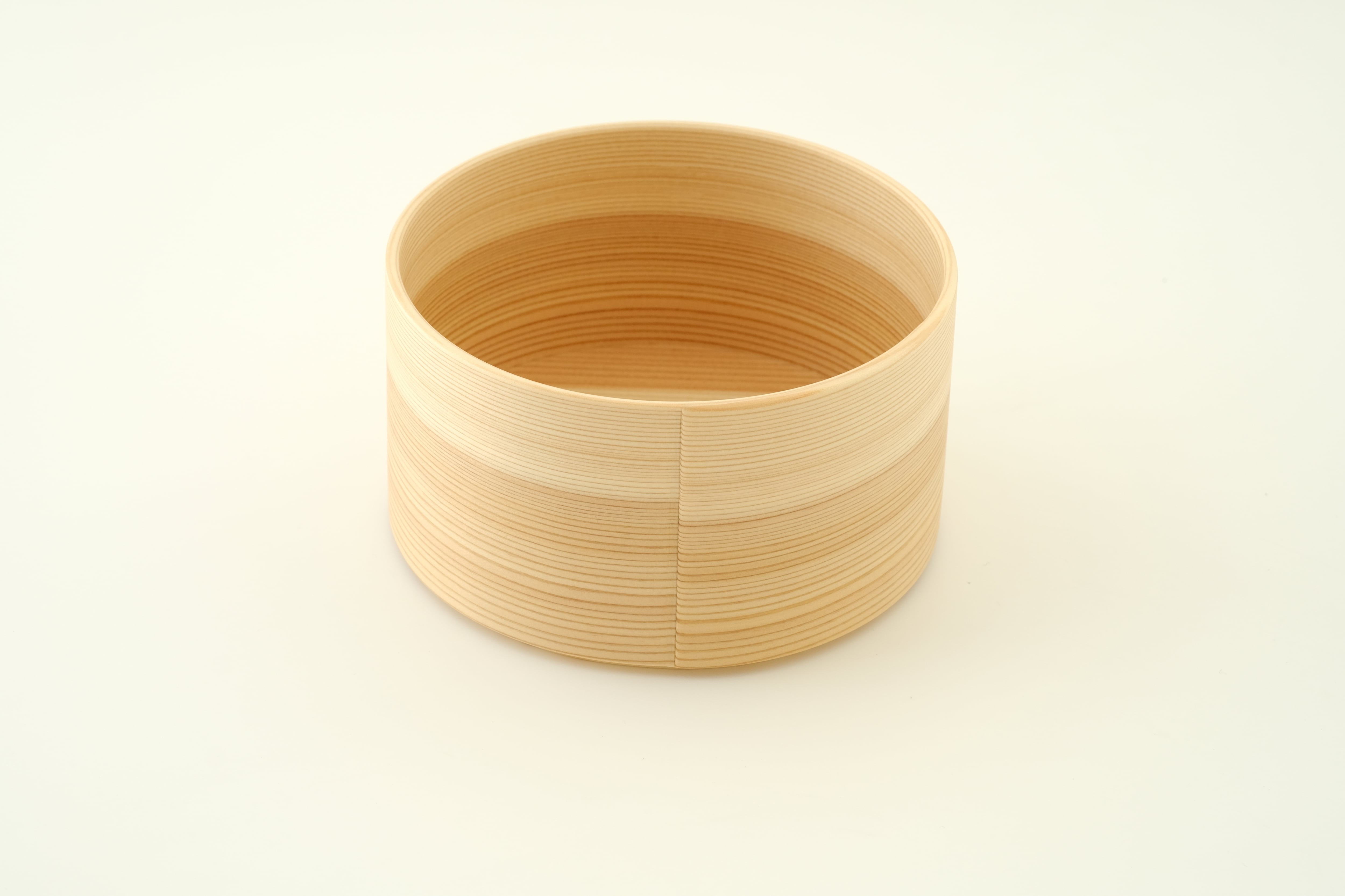 Sサイズは、スープボウルや鍋物の取り分け皿としてはもちろん、おつまみや副菜を盛り付ける器としてお使いいただくのにもちょうど良いサイズ感です。「曲げわっぱ」は、その円が小さいほど曲げるのが難しく、良質な材と高い技術が必要とされます。