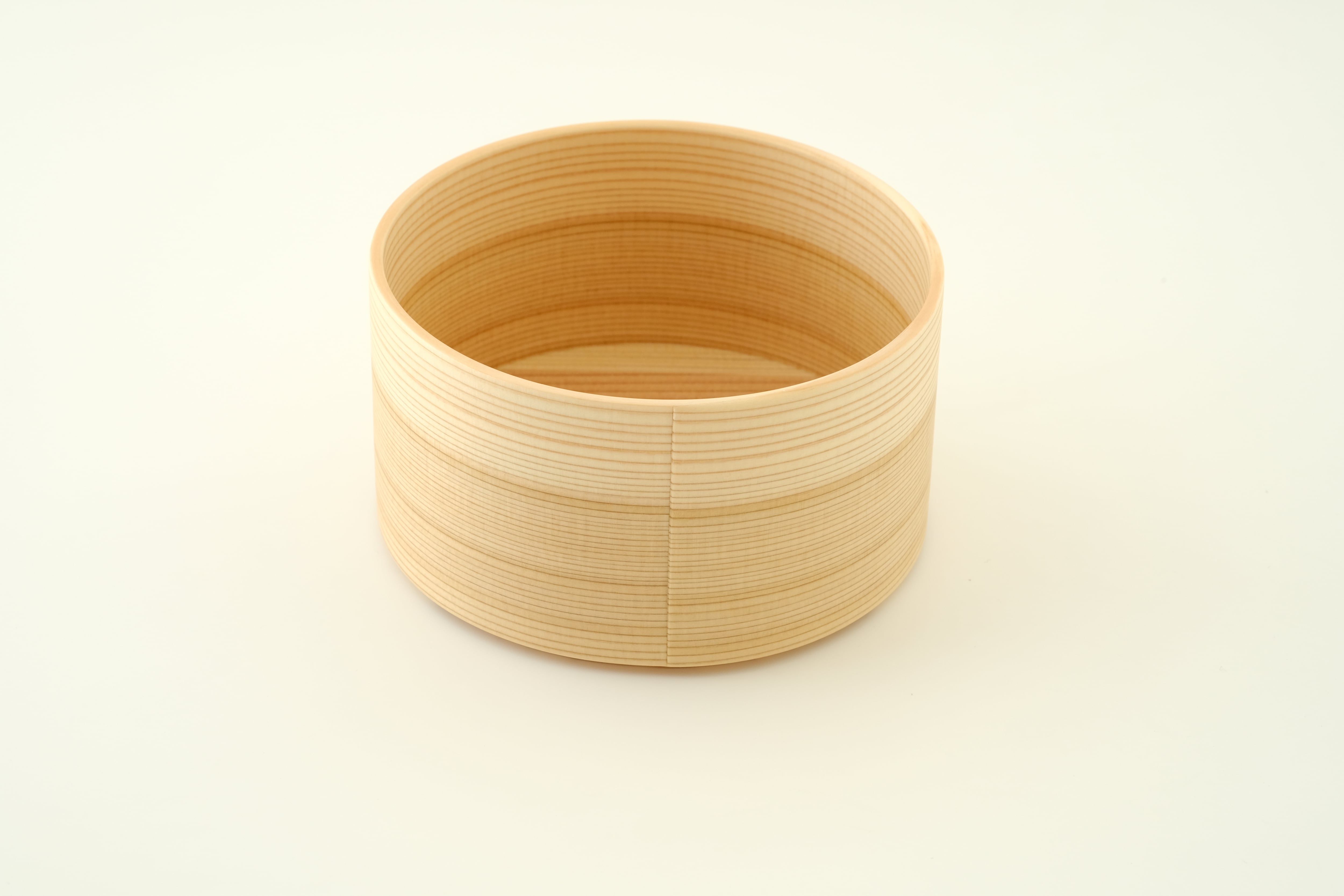 Sサイズは、スープボウルや鍋物の取り分け皿としてはもちろん、おつまみや副菜を盛り付ける器としてお使いいただくのにもちょうど良いサイズ感です。「曲げわっぱ」は、その円が小さいほど曲げるのが難しく、良質な材と高い技術が必要とされます。