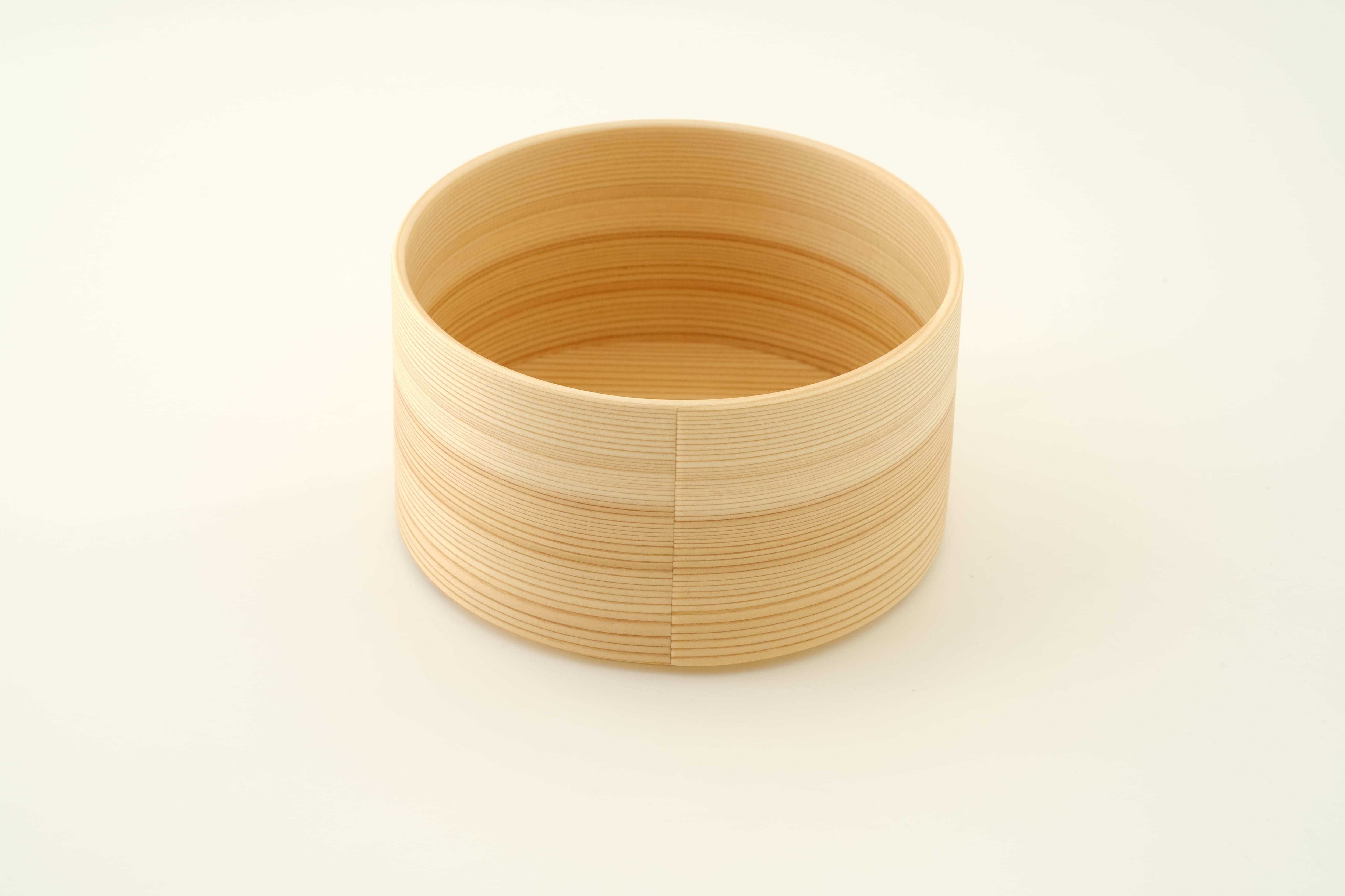 Sサイズは、スープボウルや鍋物の取り分け皿としてはもちろん、おつまみや副菜を盛り付ける器としてお使いいただくのにもちょうど良いサイズ感です。「曲げわっぱ」は、その円が小さいほど曲げるのが難しく、良質な材と高い技術が必要とされます。